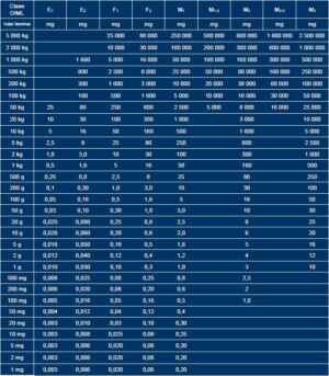 Допустими толеранси за еталонни теглилки в mg съгласно OIML R111 за класове на точност Е1, Е2, F1, F2, M1, M1-2, M2, M2-3 и M3