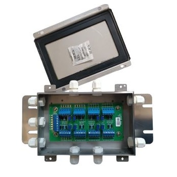Съединителна кутия за 8 броя тензодатчици с корпус от неръждаема стомана IP65 с тримери за изравняване на ъглите.